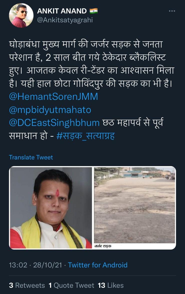जमशेदपुर : पिछले दिनों भाजपा नेता अंकित आनंद ने घोड़ाबंधा और गोविंदपुर की मुख्य सड़क को कैंसर से भी अधिक खतरनाक बताते हुए छठ महापर्वों से पूर्व इसके समाधान को लेकर मांग उठाई थी। अंकित ने जिले के उपायुक्त सूरज कुमार और सांसद विद्युत वरण महतो को ट्वीट करते हुए इस दिशा में शीघ्र पहल सुनिश्चित करने का निवेदन किया था। अंकित आनंद ने ऐलान किया था कि यदि दीपावली और छठ महापर्व से पहले सड़क निर्माण के री-टेंडर की प्रक्रिया पूरी नहीं होगी तो “सड़क सत्याग्रह” के तहत ज़ोरदार आंदोलन की शुरुआत होगी। बुधवार को माननीय सांसद के प्रतिनिधि संजीव कुमार भी पथ निर्माण विभाग के कार्यपालक अभियंता से मिलने पहुँचें थे। उन्हें जानकारी देते हुए कार्यपालक अभियंता ने बताया कि विभाग इस मामले में उचित संज्ञान लेकर प्राथमिकता पूर्वक पहल कर रही है। बताया कि छठ महापर्व से पूर्व घोड़ाबंधा की जर्जर मुख्य के निर्माण के लिए री-टेंडर की प्रक्रिया पूर्ण हो जायेगी। मालूम हो कि घोड़ाबंधा में प्लज़ा मोड़ से घोड़ाबंधा स्कूल तक 1.5 किलोमीटर लंबी सड़क का निर्माण होना है, वहीं गोविंदपुर चांदनी चौक से एनएच-33 को जोड़ने वाली पथ निर्माण विभाग की सड़क में जुड़ेगी। इसके लिए 3.20 करोड़ रुपये की राशि स्वीकृत की गई है। छठ महापर्व से पहले इस मामले में विभागीय हस्तक्षेप ना होने की स्थिति में भाजपा नेता अंकित आनंद ने “सड़क सत्याग्रह” आंदोलन के तहत ज़ोरदार आंदोलन की चेतावनी दी थी। बुधवार को सांसद प्रतिनिधि संजीव कुमार इस मामले में पथ निर्माण विभाग के जिला स्तरीय पदाधिकारियों से मिले जिसके बाद सम्बंधित प्रगति की जानकारियां उन्हें दी गई। बताया गया कि जल्द ही री-टेंडर की प्रक्रिया पूरी हो जायेगी। अंकित आनंद ने बताया कि आसन्न त्रिस्तरीय पंचायत चुनाव को दृष्टिगत रखते हुए चंद स्वघोषित प्रत्याशी इस मामले में झूठी वाहवाही बटोरना चाहते हैं, जबकि वे लंबे समय से सोये हुए थें। सड़क सत्याग्रह की घोषणा के बाद से अचानक कईयों के कान खड़े हो गये और सियासी जमीन सरकता देख लोग मामले में क्रेडिट लेने के लिए दौड़ रहे हैं। अंकित आनंद ने इस दिशा में पहल करने के लिए घोड़ाबंधा और गोविंदपुर की जनता की ओर से डीसी सूरज कुमार सहित सांसद विद्युत वरण महतो और विशेष रूप से पूर्व विधायक कुणाल षाड़ंगी के प्रति आभार जताया है। दूसरी ओर अंकित आनंद ने आश्वासन नहीं समाधान के नारे को दुहराते हुए कहा कि अब विभागीय आश्वासन से काम नहीं चलेगी, छठ महापर्व से पहले री-टेंडर की प्रक्रिया संपन्न हो किंतु सड़क पर उभरे बड़े गड्ढों को भरने के लिए उचित पहल हो ताकि छठ व्रतियों को पूजा में कठिनाई न हो।