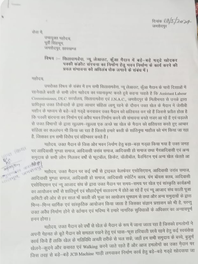 पत्र में कहा गया है कि उपरोक्त विषय के संबंध में हम सभी सितारामडेरा, न्यू लेआउट, कुँआ मैदान के चारों दिशाओं में रहनेवाले बस्ती के सभी लोग महोदय का ध्यानाकृष्ट करते हुये कहना चाहते है कि Assistant Labour Commissioner, DLC कार्यालय, सितारामडेरा एवं J.N.A.C., जमशेदपुर के मिलीभगत से उनके द्वारा प्राधिकृत द्वारा आचार संहिता लागू रहने के दौरान उक्त खेल के मैदान में जेसीबी मशीन के माध्यम से बड़े-बड़े गड्डे करवाकर उक्त मैदान को क्षतिग्रस्त कर रहे हैं।