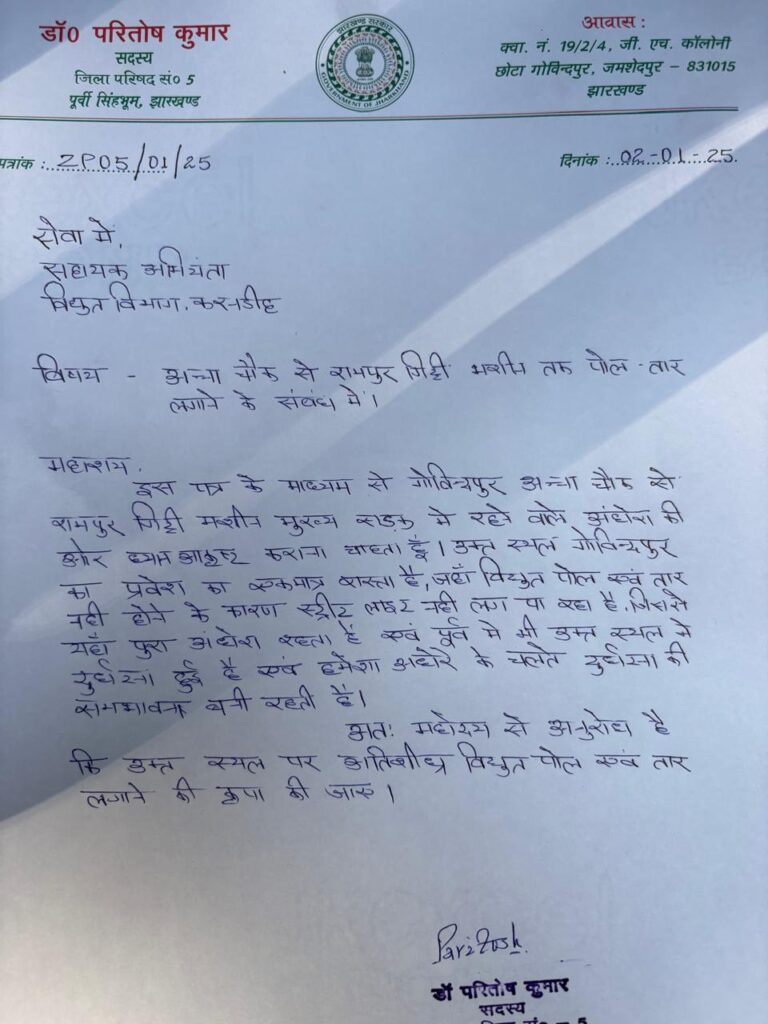 छोटागोविंदपुर:अन्ना चौक में घने अंधेरे के कारण हो रहे दुर्घटना पर घ्यान आकृष्ट करवाते हुए उक्त स्थान में जल्द से जल्द बिजली पोल एवं तार लगाने की मांग को लेकर सहायक अभियंता चंद्रशेखर महतो एवं कनीय अभियंता प्रदीप दास को ज्ञापन सौंपा।इस संबंध में जानकारी देते हुए जिला परिषद सदस्य डॉ परितोष सिंह ने कहा कि अन्ना चौक से लेकर रामपुर गिट्टी मशीन में बरसों से अंधेरा रहने के कारण हमेशा दुर्घटनाएं होती रहती है।