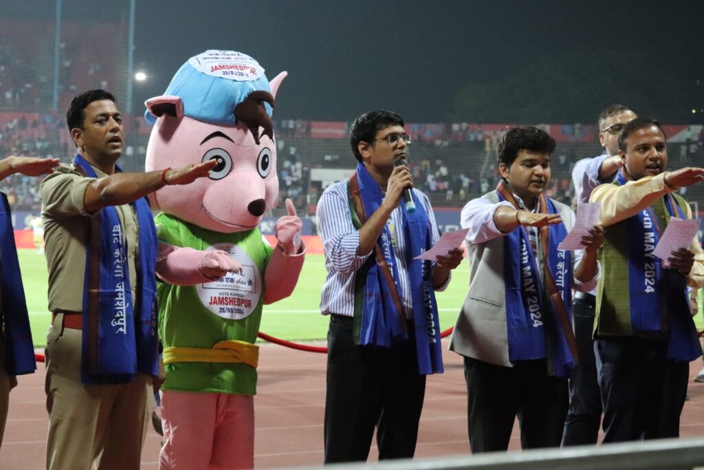 न्यूज़ टेल/डेस्क: JRD टाटा स्पोर्ट्स काम्प्लेक्स में आयोजित ISL फुटबॉल मैच के दौरान मतदाता जागरूकता अभियान संचालित किया गया। इस क्रम में फुटबॉल मैच के आयोजन के दौरान मतदाताओं को मतदान के अधिकार के प्रयोग का संदेश दिया गया । जिला निर्वाचन पदाधिकारी श्री अनन्य मित्तल, वरीय पुलिस अधीक्षक श्री किशोर कौशल, उप विकास आयुक्त श्री मनीष कुमार, सिटी एसपी श्री मुकेश लुणायत, रूरल एसपी श्री ऋषभ गर्ग, पीडी आईटीडीए श्री दीपांकर चौधरी, रेल एसपी श्री प्रवीण पुष्कर, डीटीओ श्री धनंजय समेत जिला प्रशासन के अन्य पदाधिकारी इस अवसर पर मौजूद रहे।