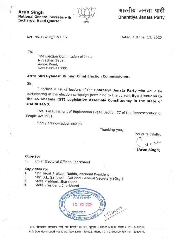 घाटशिला:झारखंड में होने वाले घाटशिला उपचुनाव को लेकर भारतीय जनता पार्टी ने अपनी तैयारियां तेज कर दी हैं। पार्टी के केंद्रीय नेतृत्व ने 40 स्टार प्रचारकों की सूची जारी की है। इस सूची में झारखंड भाजपा के शीर्ष नेताओं से लेकर अन्य राज्यों के प्रमुख नेताओं तक के नाम शामिल हैं।