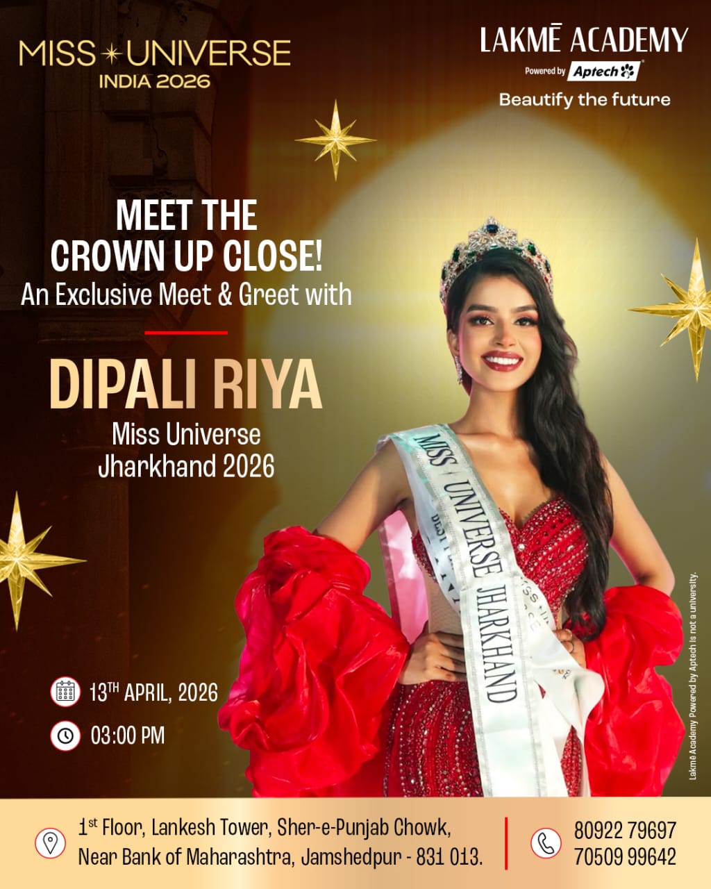 जमशेदपुर: शहर के लिए 13 अप्रैल 2026 का दिन बेहद खास और गर्व का क्षण होने जा रहा है। इस दिन लैक्मे एकेडमी (Lakmé Academy) में मिस यूनिवर्स झारखंड 2026, दीपाली रिया की गरिमामयी उपस्थिति होने जा रही है।इस अवसर पर “Meet the Crown Up Close” थीम के तहत एक विशेष Meet & Greet कार्यक्रम आयोजित किया जाएगा, जिसमें प्रतिभागियों को मिस यूनिवर्स झारखंड से सीधे मिलने और उनके अनुभवों को जानने का मौका मिलेगा। आयोजन को लेकर केंद्र में काफी उत्साह का माहौल है।कार्यक्रम 13 अप्रैल को दोपहर 3:00 बजे शुरू होगा। यह आयोजन लंकेश टॉवर, शेर-ए-पंजाब चौक, बैंक ऑफ महाराष्ट्र के पास, जमशेदपुर में आयोजित किया जाएगा।आयोजकों ने सभी को इस खास मौके पर शामिल होकर दीपाली रिया का भव्य और दिल से स्वागत करने का आग्रह किया है। यह कार्यक्रम युवाओं, खासकर फैशन और ब्यूटी इंडस्ट्री में रुचि रखने वालों के लिए प्रेरणादायक साबित होगा।