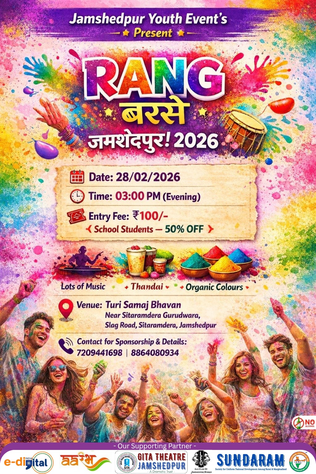 जमशेदपुर:साकची स्थित ई-डिजिटल इंस्टिट्यूट के कार्यालय में आज 21 फरवरी 2026 को जमशेदपुर यूथ इवेंट द्वारा प्रेस वार्ता कर 28 फरवरी 2026 को दोपहर 3 बजे सीतारामडेरा गुरुद्वारा के निकट तुरी समाज भवन परिसर में आयोजित होने वाले होली महोत्सव “रंग बरसे जमशेदपुर 2026” की घोषणा की गई। आयोजकों ने बताया कि जमशेदपुर के युवाओं को ध्यान में रखकर आयोजित इस कार्यक्रम में होली के सदाबहार गीत, प्राकृतिक रंग और ठंडाई की व्यवस्था रहेगी, जबकि नशापान और अश्लील गीतों पर पूर्ण प्रतिबंध रहेगा। कार्यक्रम का प्रवेश शुल्क ₹100 निर्धारित किया गया है, जिसकी आय आगामी विशेष समर कैंप में उपयोग होगी, जिसे गीता थिएटर द्वारा सरकारी स्कूलों के निम्न मध्यमवर्गीय व वंचित बच्चों के लिए आयोजित किया जाता है। आयोजकों ने बताया कि कार्यक्रम में पूर्णिमा साहू, सरयू राय, अमरप्रीत सिंह काले, दिनेश कुमार सहित प्रशासनिक प्रतिनिधियों को आमंत्रित किया जाएगा तथा होली कॉस्ट्यूम व डांस प्रतियोगिता के विजेताओं को पुरस्कृत किया जाएगा। आयोजन को लीयो क्लब जमशेदपुर, हिन्द आईटीआई, आरंभ संस्था और सुंदरम एनजीओ का सहयोग प्राप्त है। प्रेस वार्ता में गीता कुमारी, नगेंद्र कुमार, खुशी दुबे, आनंत सरदार, ओमेंदु गुप्ता, अभिषेक कुमार, हिमांशु गुप्ता, स्वाति, श्रद्धा और ई-डिजिटल के संचालक रामकृष्ण ठाकुर उपस्थित रहे। कार्यक्रम से संबंधित जानकारी और सहयोग के लिए आयोजन समिति ने 7209441698, 8864080934 और 8092623310 नंबर जारी किए हैं, जबकि पास साकची दिल्ली दरबार के समीप स्थित ई-डिजिटल इंस्टिट्यूट कार्यालय से प्राप्त किए जा सकते हैं।