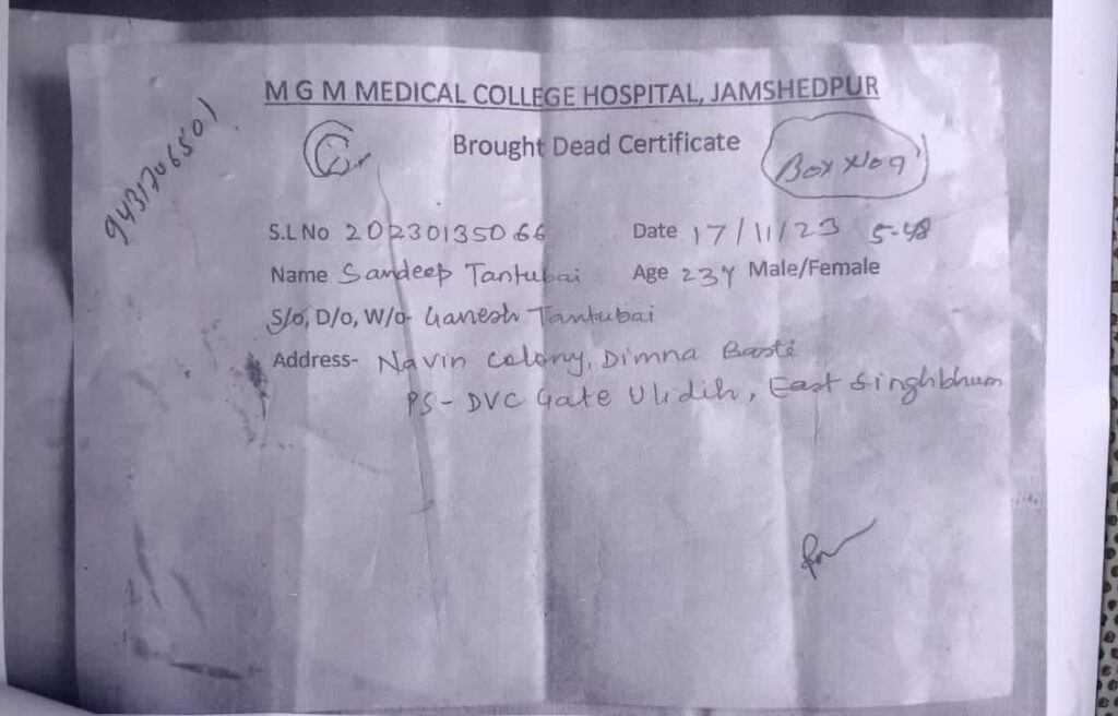 न्यूज़ टेल/जमशेदपुर: (साहिल अस्थाना) पुर्वी सिंहभूम जिले में एक जीवित युवक अपनी ही मौत का प्रमाण पत्र लेकर घूम रहा है और अपने जिंदा होने की बात विभागीय अधिकारियों को बता रहा है। जीते जी एक युवक को कागजों पर मरा हुआ घोषित कर दिया गया। दरअसल, यह चौंकाने वाला मामला पुर्वी सिंहभूम जिले के डिमना बस्ती क्षेत्र के उलीडीह अंतर्गत नवीन कॉलोनी निवासी संदीप तंतुबाई नामक 23 वर्षीय युवक की साथ हुई है। कोल्हान के सबसे बड़े सरकारी अस्पताल एमजीएम में पिछले महीने सड़क दुर्घटना में गंभीर रूप से घायल 52 वर्षीय गणेश तंतुबाई का देहांत हो गया था। जिसपर एमजीएम अस्पताल की ओर से युवक के दिवंगत पिता गणेश तंतुबाई के स्थान पर उसके पुत्र संदीप तंतुबाई को मृत घोषित कर दिया गया है। डेथ सर्टिफिकेट में उम्र भी 23 वर्ष लिखी गयी है। जिसमें सुधार करने एवं अपने दिवंगत पिता के डेथ सर्टिफिकेट बनाने को लेकर वो पिछले 1 महीने से अपनी डेथ सर्टिफिकेट लेकर अस्पताल के चक्कर लगा रहा है। एक ओर जहां मामला संज्ञान में आने के बाद चर्चा का विषय बना हुआ है।
