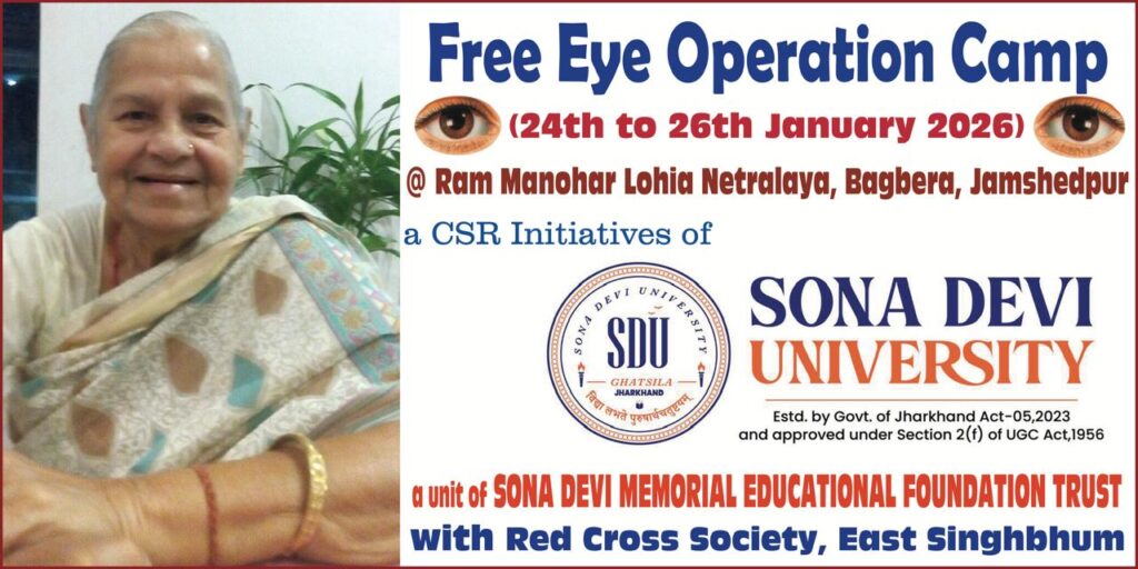 जमशेदपुर:सोना देवी की पुण्य स्मृति में सोना देवी मेमोरियल एजुकेशनल फाउंडेशन ट्रस्ट एवं सोना देवी विश्वविद्यालय, घाटशिला के संयुक्त सहयोग से नेत्र ज्योति यज्ञ सह निःशुल्क नेत्र चिकित्सा शिविर का आयोजन किया गया है। इस शिविर के अंतर्गत जरूरतमंद नेत्र रोगियों की आंखों की निःशुल्क जांच, इलाज तथा आवश्यकतानुसार आंख का ऑपरेशन कर लेंस प्रत्यारोपण किया जाएगा। शिविर का आयोजन रेडक्रॉस सोसाइटी पूर्वी सिंहभूम के सहयोग से राम मनोहर लोहिया नेत्रालय, बागबेड़ा, जमशेदपुर में किया जा रहा है। शिविर के पहले दिन 24 जनवरी 2026 को सुप्रसिद्ध नेत्र विशेषज्ञ डॉ. बी.पी. सिंह, डॉ. पूनम सिंह, डॉ. भारती शर्मा, डॉ. विवेक केडिया एवं डॉ. आनंद सुश्रुत द्वारा नेत्र रोगियों की जांच की जाएगी।