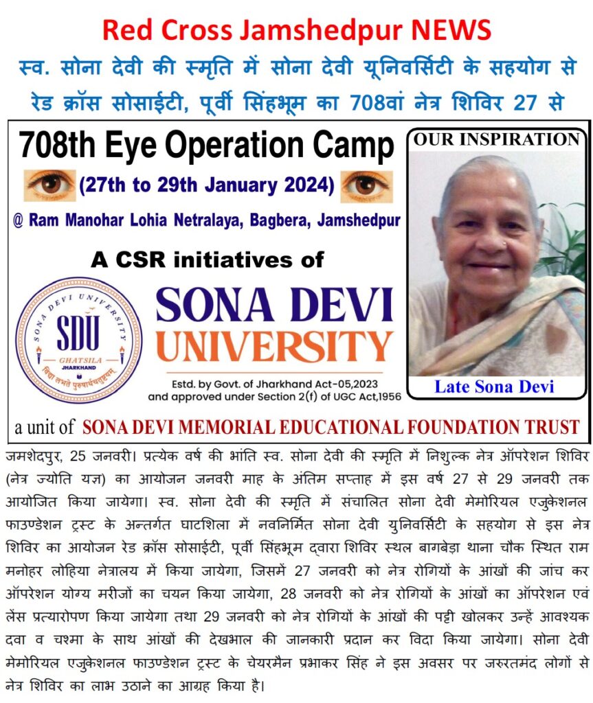 सोना देवी विश्वविद्यालय, घाटशिला ने आज के 75 वें गणतंत्र दिवस के अवसर पर तीसरे कार्यक्रम के रूप में सी०एस०आर० इनीसिएटिव के तहत स्व० सोना देवी की स्मृति में निशुल्क नेत्र ऑपरेशन शिविर (नेत्र ज्योति यज्ञ) का आयोजन कल दिनांक 27 से 29 जनवरी तक होने जा रहा है। स्व० सोना देवी की स्मृति में संचालित सोना देवी मेमोरियल एजुकेशनल फाउण्डेशन ट्रस्ट के अन्तर्गत घाटशिला में नवनिर्मित सोना देवी विश्वविद्यालय के सहयोग से इस नेत्र शिविर का आयोजन रेड कॉस सोसाईटी, पूर्वी सिंहभूम व्दारा शिविर स्थल बागबेड़ा थाना चौक स्थित राम मनोहर लोहिया नेत्रालय में किया जायेगा, जिसमें 27 जनवरी को नेत्र रोगियों के आंखों की जांच कर ऑपरेशन योग्य मरीजों का चयन किया जायेगा, 28 जनवरी को रोगियों के आंखों का ऑपरेशन एवं लेंस प्रत्यारोपण किया जायेगा तथा 29 जनवरी को नेत्र रोगियों के आंखों की पट्टी खोलकर उन्हे आवश्यक दवा व चश्मा के साथ आंखों की देखभाल की जानकारी प्रदान कर विदा किया जायेगा । सोना देवी मेमोरियल एजुकेशनल फाउण्डेशन ट्रस्ट के चेयरमैन एवं सोना देवी विश्वविद्यालय, घाटशिला, पूर्वी सिंहभूम के कुलाधिपति श्री प्रभाकर सिंह ने इस अवसर पर जरूरतमंद लोगों से नेत्र शिविर का लाभ उठाने का आग्रह कियाा ।