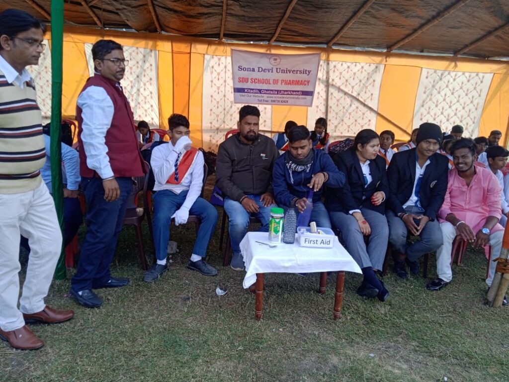 सोना देवी विश्वविद्यालय, घाटशिला ने आज के 75 वें गणतंत्र दिवस के अवसर पर दूसरे कार्यक्रम के रूप में हिन्दुस्तान कॉपर लिमिटेड (एच सी एल) मउभंडार के परेड ग्राउंड में घाटशिला प्रमण्डल के विभिन्न स्कूलों, कॉलेजों तथा महाविद्यालयों के छात्र-छात्राओं व्दारा आयोजित की जाने वाली परेडों के प्रतिभागियों के लिए एस० डी० यू० स्कूल के छात्र-छात्राओं एवं प्राध्यापकों व्दारा एक फस्ट एड कैंप का आयोजन किया गया जिसमें फस्ट एड के साथ-साथ प्रतिभागियों को मिनरल वाटर, एनर्जी ड्रिंक्स एवं ग्लुकोज आदि सोना देवी विश्वविद्यालय, घाटशिला के तरफ से फ्री में वितरित किया गया। एच सी एल प्रवन्धन के अधिकारियों व्दारा इस कार्य में पूरा – पूरा सहयोग दिया गया एवं दिल खोल कर सोना देवी विश्वविद्यालय की प्रशंसा की गई ।