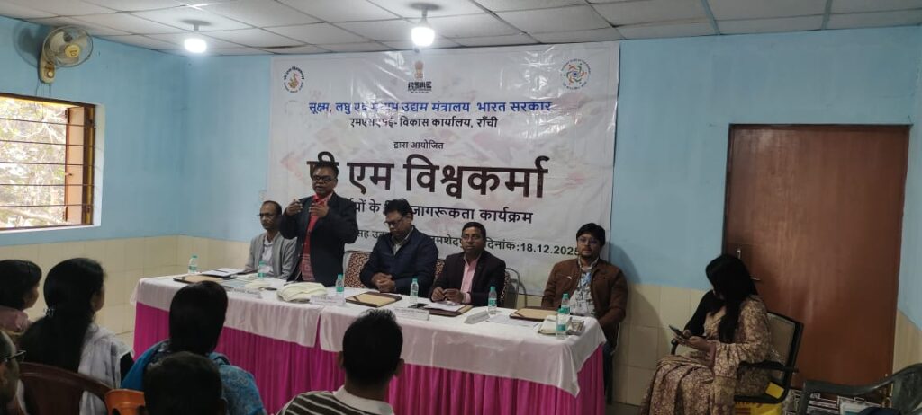 जमशेदपुर:एमएसएमई–विकास कार्यालय, रांची द्वारा भारत सरकार के सूक्ष्म, लघु एवं मध्यम उद्यम मंत्रालय के अंतर्गत पूर्वी सिंहभूम जिले में पीएम विश्वकर्मा योजना के लाभार्थियों के लिए एक दिवसीय जागरूकता कार्यशाला का आयोजन किया गया। इस कार्यक्रम का उद्देश्य पारंपरिक शिल्पकारों और कारीगरों को उनके उत्पादों एवं सेवाओं के विकास हेतु कोलैटरल फ्री क्रेडिट, स्किल ट्रेनिंग, आधुनिक टूल्स, डिजिटल लेनदेन पर प्रोत्साहन तथा मार्केट लिंकेज जैसी सुविधाओं के माध्यम से समग्र सहयोग प्रदान करना था।