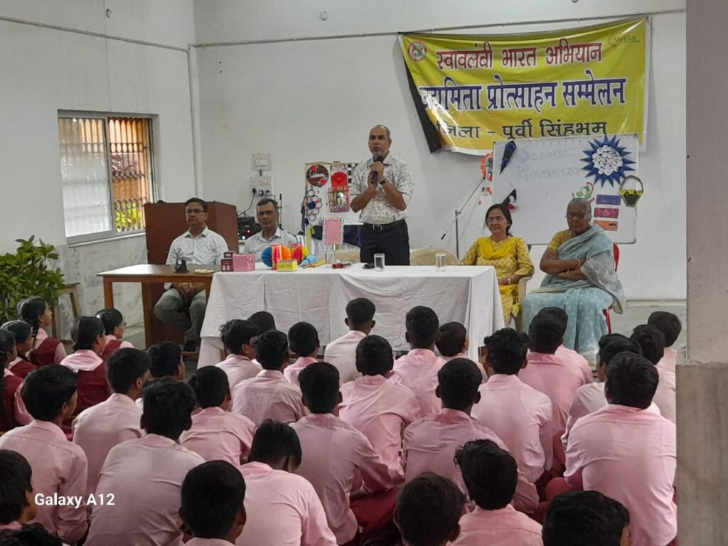 जमशेदपुर। स्वदेशी जागरण मंच ने भारत सेवाश्रम विद्यालय सोनारी के हिंदी एवं अंग्रेज़ी मीडियम के विद्यार्थियों के बीच स्वावलंबन के विषय पर चर्चा रखा और बच्चों को स्वरोजगार के प्रति प्रेरित किया।कार्यक्रम के मुख्य अतिथि भारत सरकार के आधीन खादी ग्रामोद्योग आयोग के पूर्वी भारत के चेयरमैन श्री मनोज कुमार सिंह जी ने बताया कि विद्यार्थियों को मैट्रिक पास करने के बाद से ही स्वरोजगार की राह पर चलना चाहिए।