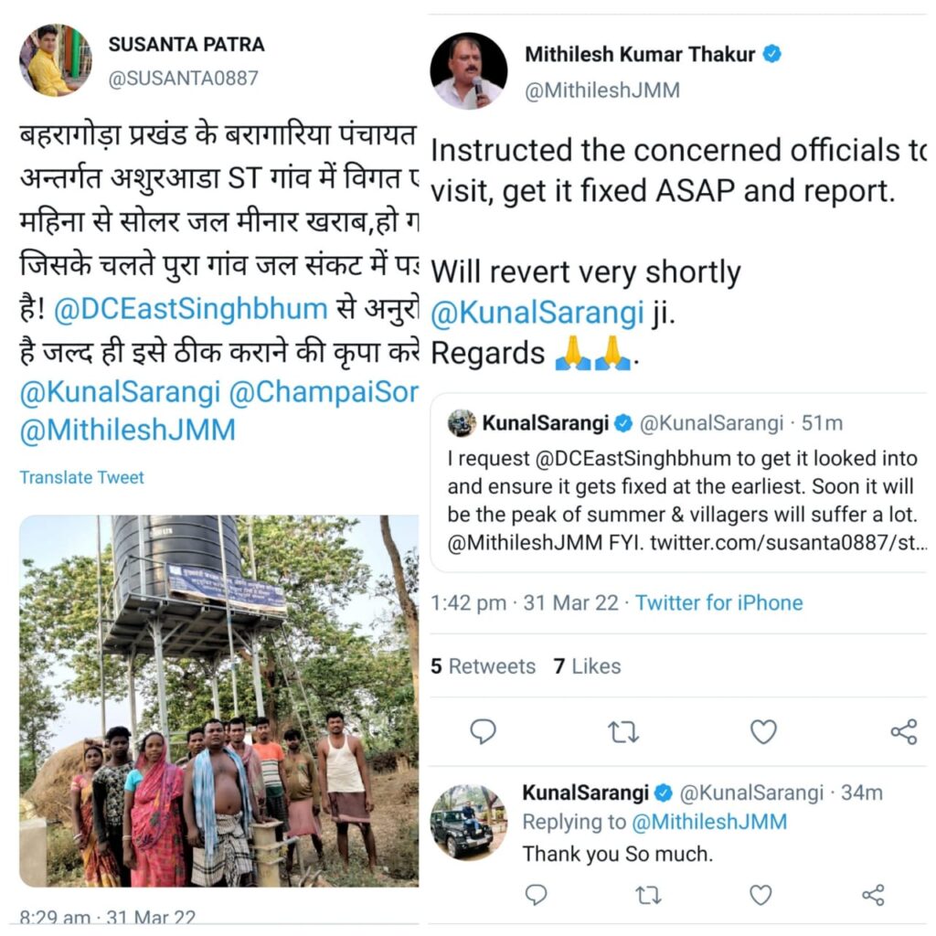 बहरागोड़ा के बरागारिया पंचायत के असुराडा गांव का जल मीनार महीनों से था खराब,पूर्व विधायक कुणाल षाड़ंगी के ट्वीट पर पेयजल मंत्री ने लिया संज्ञान